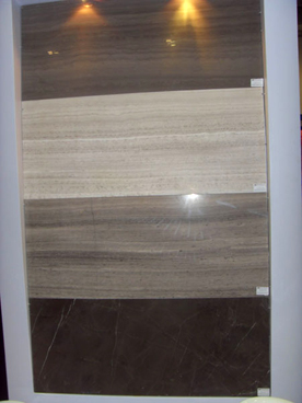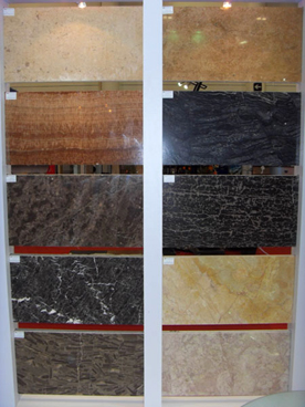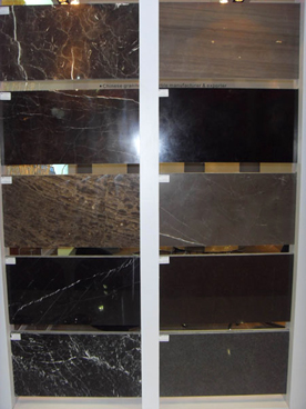 From left to right: Coffee stripe brown, Woodenstripe white, Woodenstripe grey, Antique grey, Dark emperador, Trilob brown, Coffee brown, Nero Marquina less veins, Newo Marquina more veins, Athens grey, Pure black, Antique grey, Cafe Imperial, Ice lady.
