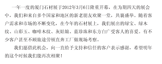 Thank you very much for meeting us at 2012 Xiamen International stone fair