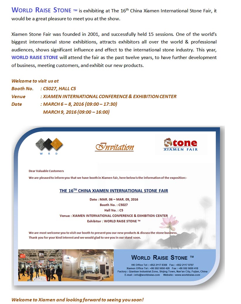 We will attend Xiamen Stone Fair during March 6-9, 2016